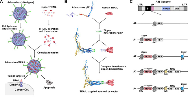 Figure 1: Diagrams of pIX-zipper-TRAIL configuration and Ad vector genomes depicting tumor targeting strategy. (A) Schematic of proposed Ad vector targeting approach showing Ad-mediated TRAIL expression and secretion, followed by cell lysis, Ad virion release and extracellular formation of a targeted Ad vector/TRAIL complex. (B) Configuration of heterodimeric zipper domains, in which one zipper domain was genetically incorporated into the C-terminus of pIX, and its counterpart was fused to the N-terminus of a recombinant TRAIL molecule. (C) Schematic diagram of recombinant Ads depicting the organization of elements. A0, rAd5-RFP; A1, rAd5-zTRAIL-RFP; A2, rAd5pz-zTRAIL-RFP; A3, rAd5-zTRAIL-RFP-Δ24E1a; A4, rAd5pz-zTRAIL-RFP-Δ24E1a.
