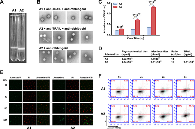 Figure 2: Chemical property analysis and biological activity of recombinant Ad vectors. (A) rAd5-zTRAIL-RFP (A1) and rAd5pz-zTRAIL-RFP (A2) purified by a second round of CsCl continuous density gradient centrifugation. The Ads are located in the white bands. (B) Immunogold labeling of rAd5-zTRAIL-RFP and rAd5pz-zTRAIL-RFP viruses reacted with anti-rabbit gold-coupled IgG with or without primary anti-TRAIL antibody. The rAd5-zTRAIL-RFP virus was incubated with the anti-TRAIL antibody and anti-rabbit IgG antibody coupled to 6-nm gold particles (top row), rAd5pz-zTRAIL-RFP was incubated with both primary and secondary antibodies (bottom row). A rAd5pz-zTRAIL-RFP control sample was reacted only with the secondary antibody (middle row). (C) The content of TRAIL on the modified virus surface was detected by ELISA. **P < 0.01. (D) The physicochemical properties of purified virus include physical titers and infectious titers, and ratios among them, and TRAIL content. (E) Apoptosis of ZR-75-30 cells induced by different MOIs and times were determined by fluorescence microscopy using the Annexin-V/PI reagent kit. Fluorescence images at 400× magnification showed changes of recombinant Ad-infected tumor cells stained with Annexin-V/PI. (F) ZR-75-30 cells treated with two viruses (rAd5-zTRAIL-RFP, rAd5pz-zTRAIL-RFP) at 100 MOI for 2, 4, 6 and 8 h. The cells were analyzed using the apoptosis assay kit and flow cytometry.