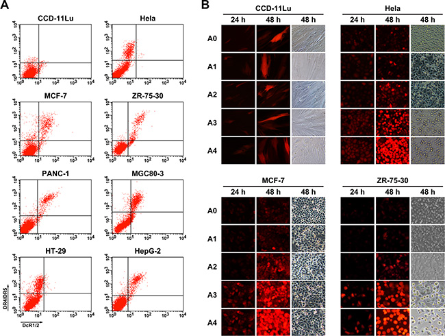 Figure 3: Expression of TRAIL receptors on normal cells and cancer cells, and in vitro detection of fluorescently labeled proteins in infected cells. (A) Cells were labeled with goat anti-DcR1/2 polyclonal antibody (x axis), mouse anti-DR4 and anti-DR5 two monoclonal antibody (y axis). The cells were then incubated with FITC-conjugated rabbit anti-goat IgG and PE-conjugated rabbit anti-mouse IgG secondary antibody and analyzed by flow cytometry. (B) RFP expression profiles were determined in normal cells (CCD-11Lu) and carcinoma cells (Hela, MCF-7, ZR-75-30) infected with Ads. Cells were infected by Ads at an MOI of 5, and the RFP fluorescent signal was detected at various times post-infection by fluorescence microcopy, and morphological changes of recombinant Ad-infected cells were observed. A0, rAd5-RFP; A1, rAd5-zTRAIL-RFP; A2, rAd5pz-zTRAIL-RFP; A3, rAd5-zTRAIL-RFP-Δ24E1a; A4, rAd5pz-zTRAIL-RFP-Δ24E1a.
