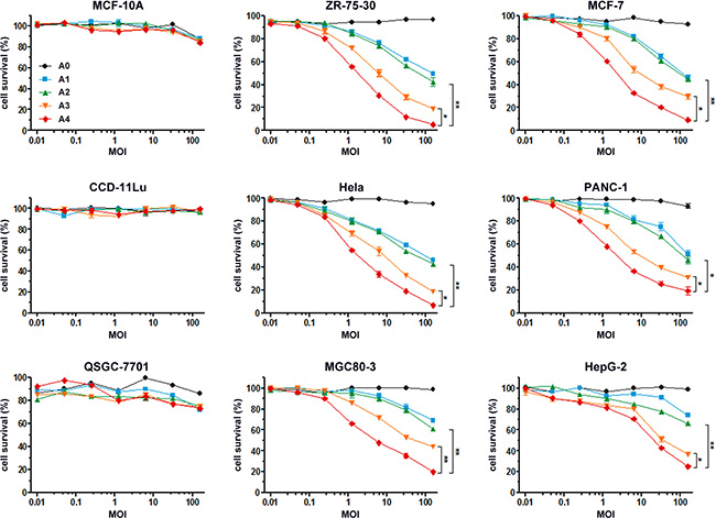 Figure 4: In vitro anti-tumor effects of recombinant Ad vectors. Normal cells and tumor cells were infected with rAd5-RFP, rAd5-zTRAIL-RFP, rAd5pz-zTRAIL-RFP, rAd5-zTRAIL-RFP-SΔ24E1a or rAd5pz-zTRAIL-RFP-SΔ24E1a at different MOI (0.01, 0.05, 0.25, 1.25, 6.25, 32.25, 156.25) for 72 h. Cell survival rates were measured as described in Materials and Methods. All data represent the mean ± standard error of measurement (SEM) of three experiments. *P < 0.05; **P < 0.01.