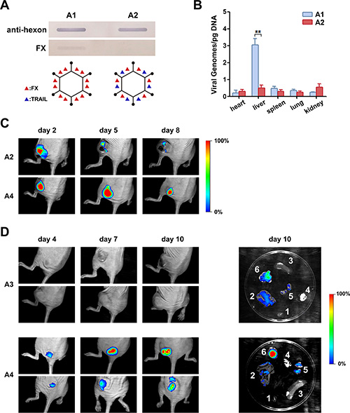 Figure 5: Analysis of FX binding with recombinant Ads and bioluminescent imaging of mice infected with RFP-expressing Ad containing a capsid-chained TRAIL protein. (A) Slot blot assay and schematic diagram of FX binding with recombinant Ads. Viruses bound to a NC membrane were incubated with FX or with a polyclonal anti-Ad capsid antibody. The linkage of TRAIL with virus particles ablated the FX binding. (B) Mice were injected IV with 5 × 1010 PFU of rAd5-zTRAIL-RFP (A1) or rAd5pz-zTRAIL-RFP (A2). After 48 h, organs were isolated, and the virus distribution was detected by RT-PCR analysis. (C) Mice bearing ZR-75-30 breast tumors were injected IT with 1 × 109 PFU of rAd5pz-zTRAIL-RFP (A2) and rAd5pz-zTRAIL-RFP-SΔ24E1a (A4). Images were captured over an 8-day period. (D) Athymic nude mice were implanted right flank with subcutaneous xenografts of ZR-75-30 cells. After tumor formation, mice were IV injected with 5 × 1010 PFU of rAd5-zTRAIL-RFP-SΔ24E1a (A3) or rAd5pz-zTRAIL-RFP-SΔ24E1a (A4). Images of representative mice from both groups are shown. On day 11, mice were sacrificed, and RFP expression levels in tumor tissues and organs were analyzed by bioluminescent imaging (right). 1, heart; 2, liver; 3, spleen; 4, lung; 5, kidney; 6, tumor tissue.