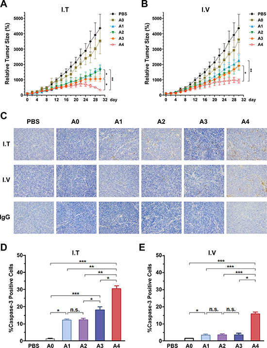 Figure 6: Anti-tumoral activity of Ads using different injection routes in vivo, and the detection of caspase-3 activation in tumor tissues treated with recombinant Ads by two routes in ZR-75-30 tumor-bearing mice. (A) Anti-tumoral activity over time in a xenograft tumor model with local treatment. Mouse models received three daily IT injections of 1 × 108 PFU of the corresponding Ad beginning on day 1. (B) Anti-tumoral activity over time in a xenograft tumor model with systemic treatment. Mouse models received three daily IV injections of 1 × 108 PFU of the corresponding Ad beginning on day 1. n = 5 tumors per treatment group. Data points are means ± SEM of tumor volumes. Individual tumor sizes on day 30 with bars indicating the mean are shown on the right. (C) Detection of caspase-3 activation in tumor tissues treated with Ads by two different methods for 15 days. IgG control was reacted just without the caspase-3 antibody (this is only I.V group, and I.T group results were not showed because of the limited space). (D) and (E) Detection of caspase-3 activation in tumor tissues treated with Ads by two different methods for 15 days. Percentages of cells positive for active caspase-3 fragments assessed by analyzing three microscopic fields at 200 magnification (mean ± SEM). n.s., nonsignificant. A0, rAd5-RFP; A1, rAd5-zTRAIL-RFP; A2, rAd5pz-zTRAIL-RFP; A3, rAd5-zTRAIL-RFP-SΔ24E1a; A4, rAd5pz-zTRAIL-RFP-SΔ24E1a; *P < 0.05, **P < 0.01, ***P < 0.001.