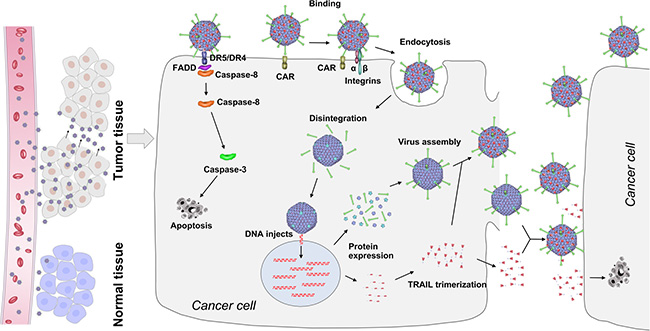 Figure 7: Schematic representation of mechanism of action of capsid-modified recombinant oncolytic Ads for cancer treatment. Capsid-modified oncolytic recombinant Ads enter the bloodstream and are transported to the cancer site efficiently. Lifet: Due to the presence of TRAIL on the surface of viral particles, the recombinant Ads quickly infect and kill tumor cells but not normal cells. Right: TRAIL on the surface of modified oncolytic recombinant Ad particles can induce apoptosis in cancer cells. Massive replication occurs, and the viral progeny are released, leading to the cytolysis of cancer cells. Furthermore, TRAIL is secreted out of the cell and diffuses outward to other cancer cells. Thus, the new viruses with TRAIL can rapidly kill surrounding tumor cells.