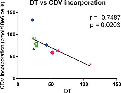 The correlation between CC50 values and doubling time indicates that the selectivity of CDV may be explained, at least in part, by a more potent inhibition of cell growth on fast proliferating cells (tumor cells) than on normal cells (which have slower proliferation rates). When the normal cells were excluded from the analysis, a significant correlation between CC50’s and doubling time was only observed at day 3 post-treatment but not at later time points. Spanos et al. described a correlation between CDV antiproliferative activities and doubling time in HNSCC after 4 days of treatment [36].