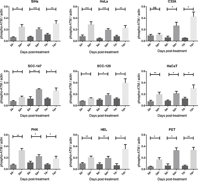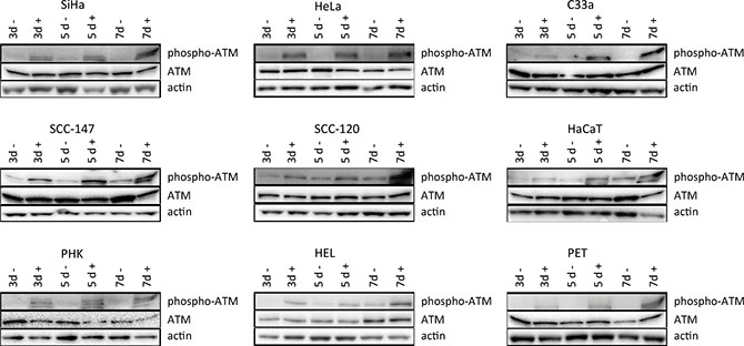 Importantly, phospho-ATM (activated ATM) levels were elevated in all CDV treated cells compared to untreated cells at almost all time points (Figures 5 and 7). A significant enhancement of phospho-ATM was seen after 3, 5 and 7 days post-CDV exposure in transformed cell lines (except for C33A in which ATM was not activated after 3 days post-treatment) and in the normal cells (i.e. PHK, HEL and PET).