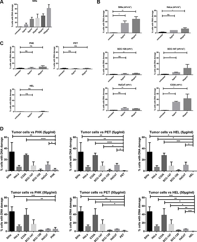 When cells were treated with 5 μg/ml CDV, a difference in DNA damage induction between treated and untreated tumor cells was detected for HPV16+ cells (SiHa and SCC-147) (p < 0.05) and C33A cells (p < 0.01) but not for HeLa, SCC-120 and HaCaT cells (Figure 8B). At a CDV concentration of 50μg/ml, a significant difference in DNA damage between treated and untreated cells was observed for the different tumor cell lines tested (Figure 8B). In contrast to tumor cells, normal cells exposed or not to 5 or 50 μg/ml of CDV showed no differences in the percentage of cells with DNA damage (Figure 8C).