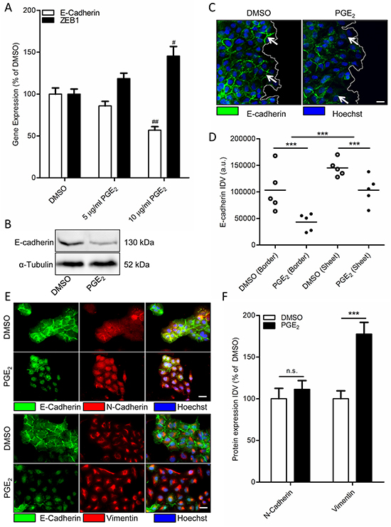 Figure 1: Effect of PGE2 on EMT in A549 cells. A. Gene expression of E-cadherin and ZEB1 following 18 hours stimulation with PGE2 (10 μg/ml). B. Representative western blot image of E-cadherin expression in a subconfluent culture of A549 cells stimulated for 18 hours with PGE2. C. Immunofluorescence images of E-cadherin after18 hours stimulation with PGE2. The white line indicates the migrating border in a scratch wound assay. White arrows in indicate areas of cell-cell contact, which are decreased in cells on the migrating border in the right image. Scale bar represents 20 μm. D. Quantification of E-cadherin expression in migrating border cells and cells incorporated in an epithelial sheet. Each points represents the average integrated density value (IDV) of 20 cells. E. Immunofluorescence images of N-cadherin/E-cadherin and Vimentin/E-cadherin after18 hour stimulation with PGE2. Scale bar represents 20 μm. Data represent mean ± SEM of 5 separate experiments. # p < 0.05, ## p < 0.01 compared to DMSO treated cells. *** p < 0.001 between the indicated groups. F. Quantification of N-cadherin and Vimentin expression in cells treated for 18h with DMSO or PGE2.
