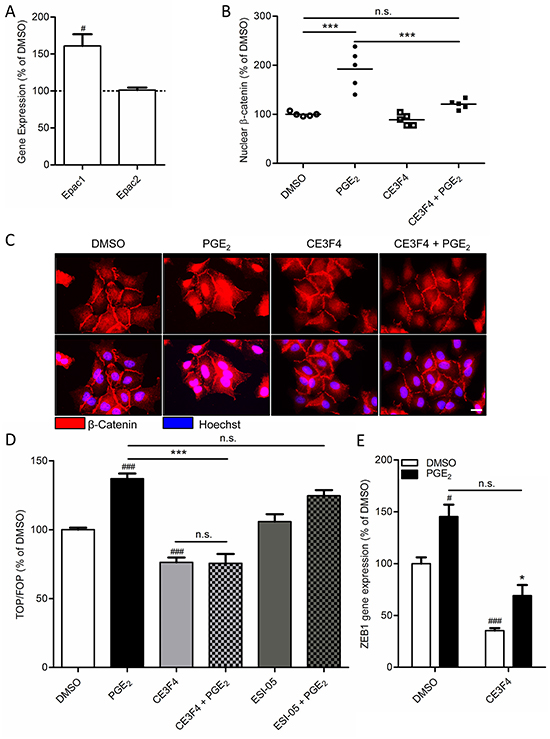 We observed that specific inhibition of Epac1 using the pharmacological inhibitor CE3F4 [37] not only decreased migration of NSCLC cells, but also abolished PGE2-induced nuclear accumulation of β-catenin, activation of β-catenin-dependent transcription and expression of the EMT regulator ZEB1. Using Epac1 siRNA, we were able to confirm that these observations were due to Epac1 inhibition and not due to off-target effects of the compound.