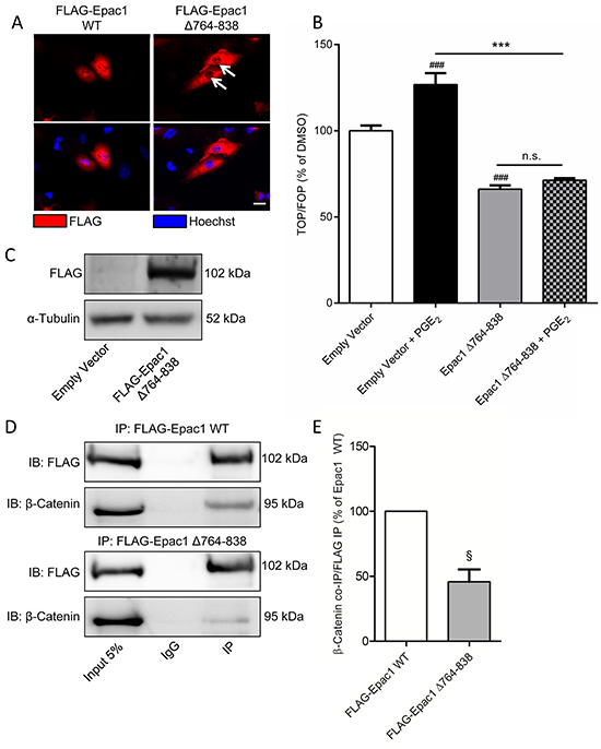 Figure 6: Expression of a mutant Epac1 with a deletion of the 764-838 domain has aberrant localization and prevents PGE2-induced β-catenin transcriptional activity in A549 cells. A. Immunofluorescence images of FLAG-tagged Epac1 wildtype (WT) and Epac1 Δ764-838. White arrows indicate absence of nuclear localization for the Epac1 deletion mutant. Scale bar represents 40 μm. B. TOPFlash assay of cells transfected with Epac1 Δ764-838 and subsequent PGE2 treatment. C. Western blot image confirming successful expression of FLAG-tagged Epac1 Δ764-838. D. Western blot images of a FLAG immunoprecipitation showing co-immunoprecipitation of Epac1 and β-catenin in FLAG-Epac1 WT transfected cells, which is attenuated in and FLAG-Epac Δ764-838 transfected cells. For input we used 5% of the amount of protein used for co-immunoprecipitation. E. Quantification of β-catenin co-immunoprecipitation with FLAG immunoprecipitation. β-Catenin was normalized for the amount of FLAG immunoprecipitated. Data represent mean ± SEM of 3-9 separate experiments. # p < 0.05, ### p < 0.001 compared to empty vector transfected cells. § p < 0.05 compared to FLAG-Epac1 WT transfected cells. *** p < 0.001 between the indicated groups.