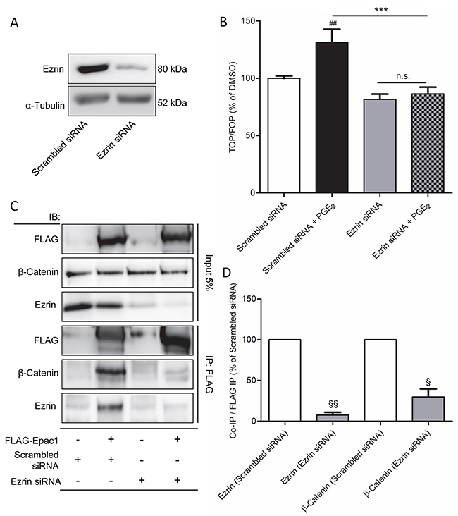 Figure 7: Ezrin knockdown prevents PGE2-induced β-catenin transcriptional activity in A549 cells. A. Knockdown of Ezrin protein in Ezrin siRNA transfected cells. B. TOPFlash assay of cells transfected with non-targeting siRNA or Ezrin siRNA for 48 hours and subsequent PGE2 treatment. C. FLAG co-immunoprecipitation of Epac1, β-catenin and Ezrin in FLAG-Epac1 WT transfected and Ezrin silenced cells. For input we used 5% of the amount of protein used for co-immunoprecipitation. D. Quantification of β-catenin and Ezrin co-immunoprecipitation with FLAG immunoprecipitation. β-Catenin and Ezrin were normalized for the amount of FLAG immunoprecipitated. Data represent mean ± SEM of 3-9 separate experiments. ## p < 0.01 compared to non-targeting siRNA transfected cells. § p< 0.05, §§ p < 0.01 compared to scrambled siRNA transfected cells. *** p < 0.001 between the indicated groups.
