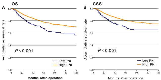 For patients from the CMU-SO, low PNI was significantly associated with older age, larger tumor size, tumor location in the colon, poor differentiation, increased tumor depth, advanced TNM stages, and fewer patients on postoperative chemotherapy. There was no significant difference in the sexes (P = 0.193), lymph node metastasis status (P = 0.276), or distant metastasis status (P = 0.072) between the low- and high-PNI groups (Table 1).