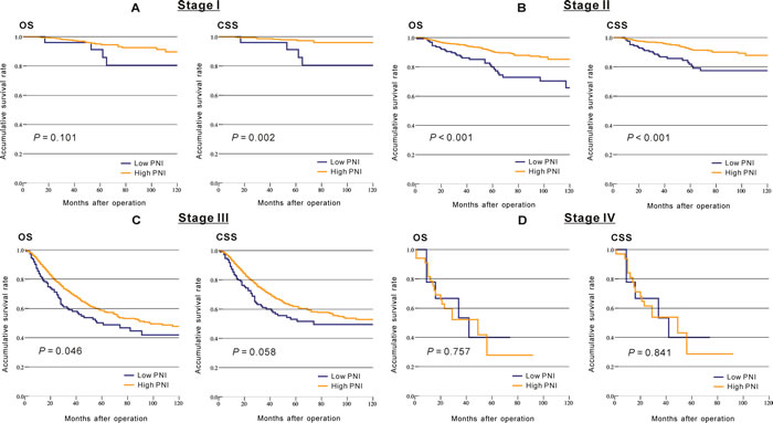 Figure 2: Kaplan-Meier analysis of the overall survival (OS) and cancer-specific survival (CSS) based on low and high prognostic nutritional index among patients from CMU-SO with stage I (A., OS, P = 0.101; CSS, P = 0.002), stage II (B., OS, P < 0.001; CSS, P < 0.001), stage III (C., OS, P = 0.046; CSS, P = 0.058) and stage IV (D., OS, P = 0.757; CSS, P = 0.841).