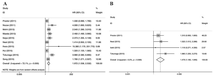 Figure 3: Meta-analysis of the association between low prognostic nutritional index and survival in CRC: A. overall survival; B. cancer-specific survival.