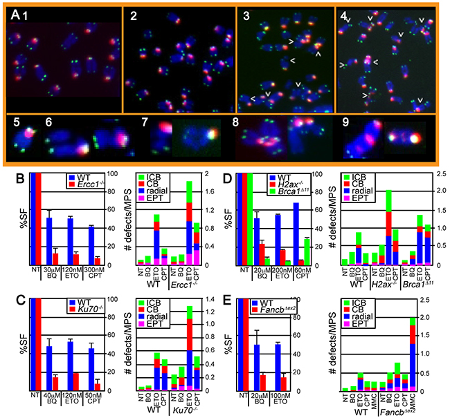 Figure 2: Evaluation of chromosome damage in metaphase spreads (MPS) after ES cells were exposed to BQ, ETO and CPT. A. Images of H2ax-/- cells exposed to 1) nothing, 2) BQ, 3) CPT and 4) ETO. Arrowheads point to chromosomal abnormalities. Enlarged representative examples of chromosomes include 5) normal, 6) isochromatid break (ICB), 7) chromatid break (CB), 8) radial and 9) extrapericentromeres and telomeres (EPT). B–E. The survival fraction (%SF) is shown on the left panel and the # of chromosomal defects is shown on the right panel. (B) Wild type and Ercc1-mutant IB10 cells. (C) Wild type and Ku70-mutant J1 cells. (D) Wild type and H2ax- and Brca1-mutated TC1 cells. (E) Wild type and Fancb-mutated AB2.2 cells. Cells were also exposed to an equivalently toxic dose of Mitomycin C (MMC), a crosslinking agent that is known to be very toxic to FA-defective cells. The concentration for CPT (100 nM, 16 hours) and MMC (30 nM, 16 hours) results in ~ 10% and 90% survival for control cells and ~ 10% and <0.001% survival for FancbΔex2 cells as previously reported [38]. Note that MMC induces a much larger level of cell death and radials relative to control cells than the other agents relative to control cells demonstrating that FancbΔex2 cells are particularly susceptible to MMC as compared to the other agents. The total number of MPS observed for each bar and statistics are shown in supplemental tables 1 and 2, respectively.