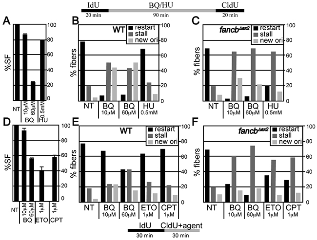 Figure 3: Fiber analysis. A-C. ES cells were exposed to IdU for 20 minutes and then agent (BQ or HU) for 90 minutes and then CldU for 20 minutes. (A) Percent survival fraction (%SF) using the identical condition as the fiber analysis. (B) Fiber analysis in wild type AB2.2 cells. (C) Fiber analysis in Fancb-mutant cells. D-E. ES cells were exposed to IdU for 30 minutes and CldU + agent for 30 minutes. (D) Percent survival fraction (%SF) using the identical conditions for the fiber analysis. E. Fiber analysis in wild type AB2.2 cells. F. Fiber analysis in Fancb-mutant cells. The total number of fibers observed for each bar and statistics are shown in supplemental tables S3 and S4, respectively.