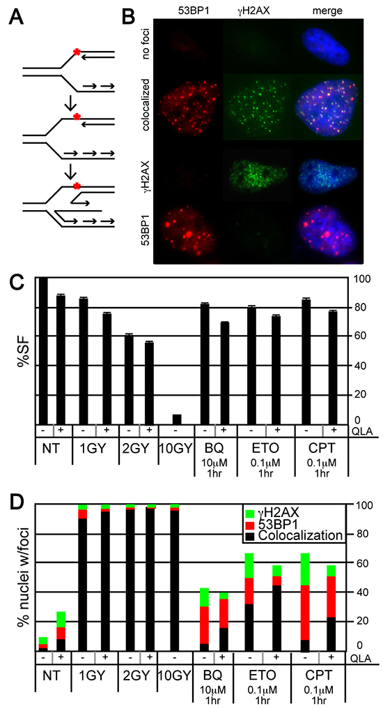 Figure 5: Evaluation of γH2AX and 53BP1 foci in HeLa cells exposed to BQ. A. The formation of a regressed fork (chicken foot). The red asterix is a symbol for DNA damage that stalls a fork. This damage could be a CPT-type 1 topoisomerase cleavage complex. B. Representative examples of nuclei with no foci, colocalized foci, γH2AX foci, and 53BP1 foci. C. Survival fraction after exposure to ionizing γ-radiation [IR: 1-10 Gray (Gy)], olaparib (OLA, 10 μM), BQ, ETO and CPT. D. The percentage of nuclei with separated or colocalized γH2AX and 53BP1 foci. Ten or more foci are needed to be positive. The total number of nuclei observed for each bar and statistics are shown in supplementary tables S5 and S6, respectively.