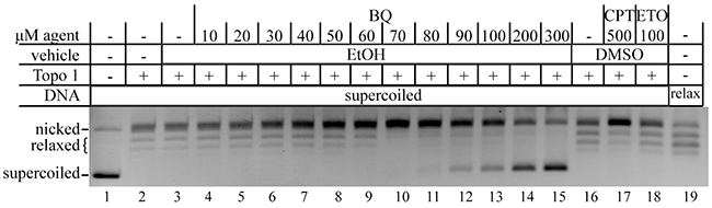Figure 6: BQ inhibits type 1 topoisomerase (topo 1). CPT is a positive control and ETO is a negative control. The relaxed DNA shown in lane 19 is a control that came with the kit.
