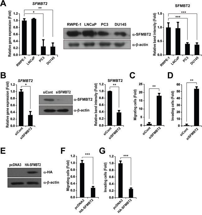 Figure 1: SFMBT2-mediated cell migration and invasion in LNCaP cells. A. Differential expression level of SFMBT2 in normal prostate and prostate cancer cell lines. Transcripts of SFMBT2 and GAPDH were determined by quantitative PCR in RWPE-1, LNCaP, PC3, and DU145 cells (n=3). The cell lysates were immunoblotted with anti-SFMBT2 and anti-β-actin antibodies, respectively (n=3). Western blots were analyzed quantitatively. B. Knockdown of SFMBT2 results in increased cell migration and invasion in LNCaP cells. After control (siCont) or SFMBT2 siRNA (siSFMBT2) were transfected, LNCaP cells were subjected to RNA and protein extraction (n=3). Transcripts of SFMBT2 and GAPDH were determined by quantitative PCR. The cell lysates were immunoblotted with anti-SFMBT2 and anti-β-actin antibodies, respectively. Western blots were analyzed quantitatively. C. After control or SFMBT2 siRNA were transfected, LNCaP cells were subjected to a cell migration assay using a modified Boyden chamber containing uncoated Transwell polycarbonate membrane filters (n=3). The migrated cells stained with cresyl violet were counted. D. After control or SFMBT2 siRNA were transfected, LNCaP cells were subjected to a cell invasion assay using a Biocoat Matrigel invasion chambers (n=3). Invading cells on the membrane stained with cresyl violet were counted. E. PC3 cells were transfected with pcDNA3 or pcDNA3-SFMBT2-HA plasmid (n=3). The cell lysates were immunoblotted with anti-HA and anti-β-actin antibodies, respectively. F, G. After PC3 cells were transfected with pcDNA3 or pcDNA3-SFMBT2-HA plasmid, cell migration assay (n=3) and invasion assay (n=3) were performed. All data represent mean ± S.E.M. Significance values were * P≤0.05, ** P≤0.01 and *** P≤0.005.