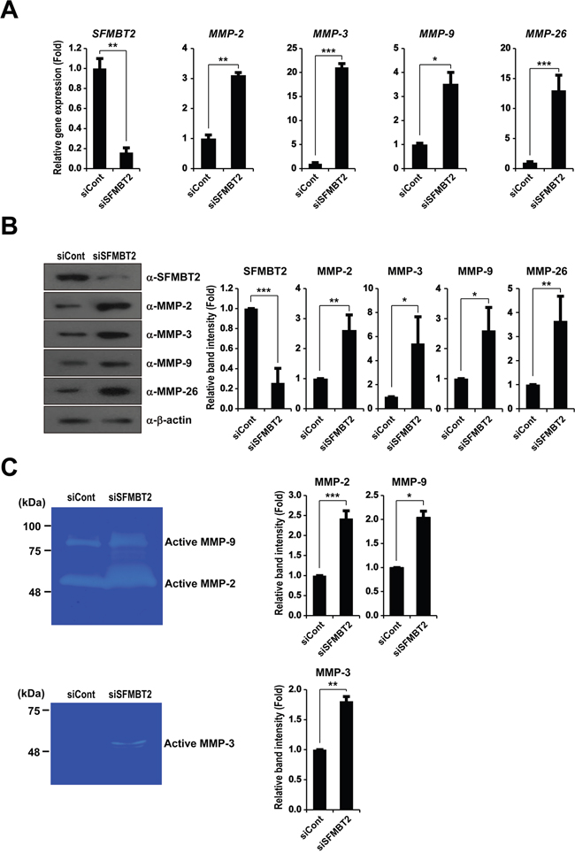 Figure 2: SFMBT2 regulates expression of matrix metalloproteinase in LNCaP cells. Knockdown of SFMBT2 increases expression of the MMP-2, MMP-3, MMP-9, and MMP-26 gene in LNCaP cells. A. After control or SFMBT2 siRNA were transfected, LNCaP cells were subjected to RNA extraction (n=3). Transcripts of MMP-2, MMP-3, MMP-9, MMP-26, and GAPDH were determined by quantitative PCR. B. The cell lysates were immunoblotted with anti-MMP-2, anti-MMP-3, anti-MMP-9, and anti-MMP-26 antibodies, respectively (n=3). Anti-β-actin was used as a loading control. Western blots were analyzed quantitatively. C. Elevation of enzyme activities of MMP-2, MMP-3, and MMP-9 in SFMBT2 knockdown LNCaP cells. Zymography was performed using the lysates from control and SFMBT2 siRNA-transfected cells (n=3). Equal amounts of the lysate were used for each reaction. Zymography was analyzed quantitatively. All data represent mean ± S.E.M. Significance values were * P≤0.05, ** P≤0.01, and *** P≤0.005.