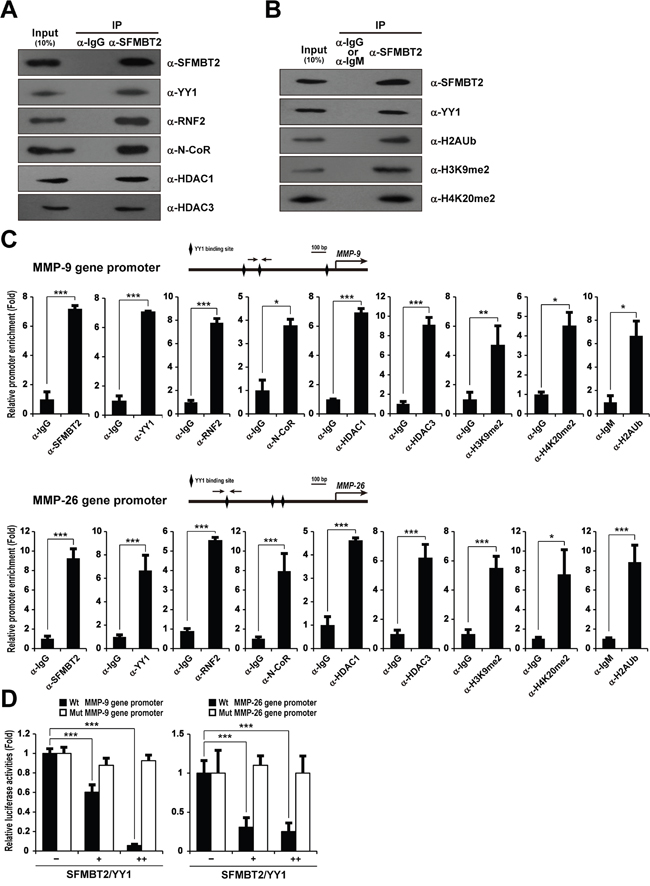 Figure 3: Recruitment of SFMBT2, YY1, RNF2, N-CoR, HDAC1, and HDAC3 to the MMP-9 and MMP-26 gene promoters in LNCaP cells. A, B. SFMBT2 interacts with YY1, RNF2, N-CoR, HDAC1, HDAC3, and repressive histone marks. The lysates from LNCaP cells were immunoprecipitated with the anti-SFMBT2 antibody, then immunoblotted with anti-SFMBT2, anti-YY1, anti-RNF2, anti-N-CoR, anti-HDAC1, anti-HDAC3, anti-dimethyl H3K9 (H3K9me2), anti-dimethyl H4K20 (H4K20me2), and anti-mono-ubiquitinated H2AK119 (H2AK119Ub) antibodies, respectively (n=3). Immunoprecipitation with normal IgG or IgM was used as a negative control. C. Enrichment of SFMBT2, YY1, RNF2, N-CoR, HDAC1, and HDAC3 on the MMP-9 and MMP-26 gene promoters in LNCaP cells. A ChIP assay was performed using anti-SFMBT2, anti-YY1, anti-RNF2, anti-N-CoR, anti-HDAC1, anti-HDAC3, anti-H3K9me2, anti-H4K20me2, and anti-H2AK119Ub antibodies, respectively (n=3). The occupancy of each protein was determined by quantitative PCR in MMP-9 and MMP-26 gene promoters encompassing the YY1 binding site using oligonucleotide primers (arrows). ChIP using normal IgG or IgM was performed as a negative control. D. Repression of the MMP-9 and MMP-26 gene promoter reporter activity by over-expression of SFMBT2 and YY1. However, over-expression of SFMBT2 and YY1 does not affect the reporter activity of MMP-9 and MMP-26 gene promoters containing a mutated the YY1 binding site. LNCaP cells were transiently transfected with the human MMP-9 and MMP-26 gene promoter-driven firefly luciferase reporter vector in conjunction with a control Renilla luciferase expression vector (n=3). Expression vectors for SFMBT2 and YY1 were transfected. Reporter activity is represented as fold activation relative to Renilla luciferase activity. All data represent mean ± S.E.M. Significance values were * P≤0.05, ** P≤0.01, and *** P≤0.005.
