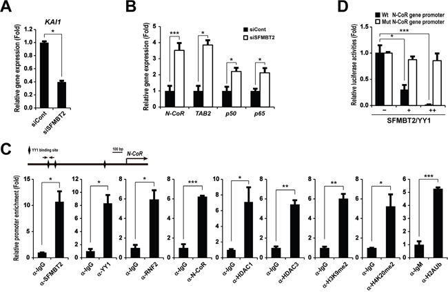 Since the low expression level of the KAI1 has been shown to relate to prostate metastasis [37, 38], we tested whether SFMBT2 regulates KAI1 gene expression. Interestingly, expression of the KAI1 gene was down-regulated in SFMBT2 knockdown LNCaP cells (Figure 4A). Thus, we tested the possibility that SFMBT2 may negatively regulate transcriptional repressors for the KAI1 gene. Among known transcriptional repressors for the KAI1 gene [39], we found up-regulation of N-CoR, TAB2, and NF-κB (p65 and p50) in SFMBT2 knockdown LNCaP cells (Figure 4B). To investigate whether SFMBT2/YY1 directly represses N-CoR, TAB2, p65, and p50 gene expression, we identified functional YY1 binding sites in each gene using in silico bioinformatic analysis (Supplementary Figure S3), ChIP assay, and mutagenesis. Our results indicated that SFMBT2 and YY1 are bound significantly to the N-CoR gene promoter, while we did not observe a significant recruitment of SFMBT2 and YY1 on other genes (Figure 4C and Supplementary Figure S6). We also observed a significant enrichment of RNF2, N-CoR, HDAC1, and HDAC3 as well as repressive histone marks on the N-CoR gene promoter (Figure 4C). Over-expression of SFMBT2 and YY1 repressed reporter activity of the N-CoR gene promoter while reporter activity of the N-CoR gene promoter containing a mutated YY1 binding site did not changed by over-expression of SFMBT2 and YY1 (Figure 4D).