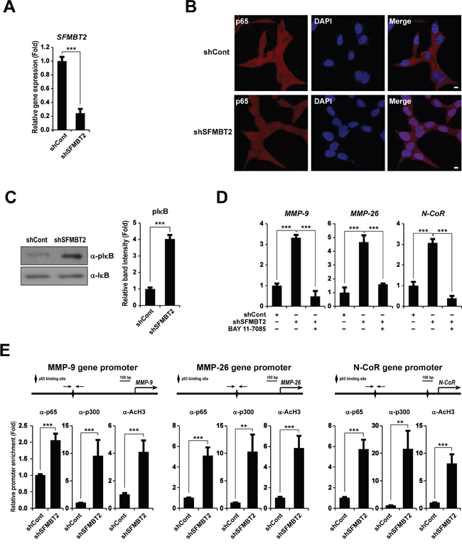 Figure 5: NF-κB activates MMP-9, MMP-26, and N-CoR gene expression in SFMBT2 knockdown LNCaP cells. A. After control or SFMBT2 shRNA were transfected stably in LNCaP cells, transcripts of SFMBT2 and GAPDH were determined by quantitative PCR (n=3). B. NF-κB activation in SFMBT2 knockdown LNCaP cells. Knockdown of SFMBT2 results in the nuclear localization of NF-κB p65. Representative photomicrographs of NF-κB p65 in SFMBT2 knockdown LNCaP cells. After control or SFMBT2 shRNA were transfected stably, cells were immunostained with the anti-NF-κB p65 antibody (n=3). Nuclei were identified using DAPI staining. Scale bar, 10 μm. C. Increased phosphorylation of IκB in SFMBT2 knockdown LNCaP cells. After control or SFMBT2 shRNA were transfected stably, lysates were immunoblotted with the anti-IκB and anti-phospho IκB (pIκB) antibodies, respectively (n=3). Western blots were analyzed quantitatively. D. Inactivation of NF-κB by BAY 11-7085 attenuates up-regulation of the MMP-9, MMP-26, and N-CoR genes in SFMBT2 knockdown LNCaP cells. After control or SFMBT2 shRNA were transfected stably, cells were treated with DMSO control or BAY 11-7085. Transcripts of MMP-9, MMP-26, N-CoR, and GAPDH were determined by quantitative PCR (n=3). E. Enrichment of NF-κB p65 and p300 on the MMP-9, MMP-26, and N-CoR gene promoters in SFMBT2 knockdown LNCaP cells. After control or SFMBT2 shRNA were transfected stably, a ChIP assay was performed in LNCaP cells using anti-NF-κB p65, anti-p300, and anti-acetylated H3 antibodies, respectively (n=3). The occupancy of each protein was determined by quantitative PCR in MMP-9, MMP-26, and N-CoR gene promoters encompassing the NF-κB binding site using oligonucleotide primer (arrows). ChIP using normal IgG or IgM was performed as a negative control. All data represent mean ± S.E.M. Significance values were ** P≤0.01 and *** P≤0.005.