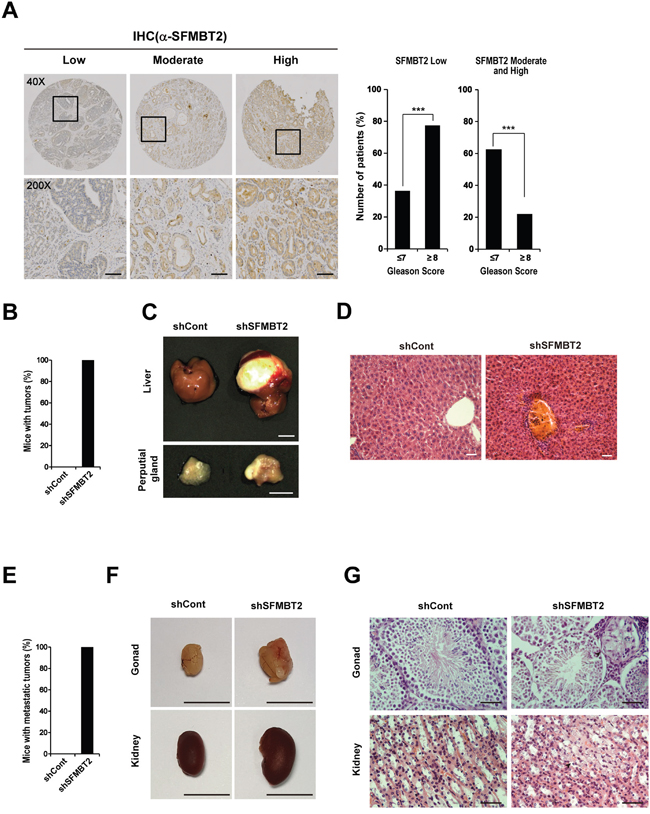 Figure 6: SFMBT2 negatively regulates prostate cancer metastasis in vivo. A. Inverse relationship of SFMBT2 expression with Gleason score in prostate cancer. Expression level of SFMBT2 in the specimens with Gleason scores of ≥ 8 was lower than in those with Gleason scores of ≤ 7. Fisher's exact test was used to calculate P values. Immunohistochemical staining of a tissue array from prostate cancer patients was performed using the anti-SFMBT2 antibody. Representative photomicrographs show the low, moderate, and high expression of SFMBT2. Scale bar, 50 μm. B. LNCaP cells (1x106 cells) transfected stably with control (shCont)- or SFMBT2 shRNA (shSFMBT2)-GFP were injected into the tail vein of nude mice, respectively (n=3/group). All mice injected with shSFMBT2-GFP LNCaP cells had tumors. C. Representative photomicrographs show liver and perputial gland tumors in shSFMBT2-GFP LNCaP cells-injected mice at week 15 post injection. Scale bar; 1 cm. D. Infiltration of shSFMBT2-GFP LNCaP cells in the liver. Livers from control (shCont)- or SFMBT2 shRNA (shSFMBT2)-GFP LNCaP cell-injected mice were fixed, sectioned, and stained with H & E. Scale bar, 50 μm. E. LNCaP cells (1x106 cells) transfected stably with control (shCont.)- or SFMBT2 shRNA (shSFMBT2)-GFP were injected into the prostate (dorsal lobe) (n=3/group). All mice injected with shSFMBT2-GFP LNCaP cells had metastatic tumors. F. Representative photomicrographs show gonad and kidney tumors in shSFMBT2-GFP LNCaP cells-injected mice at week 5 post injection. Scale bar; 1 cm. G. Infiltration of shSFMBT2-GFP LNCaP cells in the gonad and kidney. Gonad and kidney from control (shCont)- or SFMBT2 shRNA (shSFMBT2)-GFP LNCaP cell-injected mice were fixed, sectioned, and stained with H & E. Scale bar, 50 μm. All data represent mean ± S.E.M. Significance values were * P≤0.05 and *** P≤0.005.