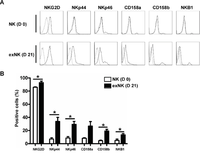 Figure 2: NK cell Phenotyping on day 0 and day 21. NK cell expression of activating receptors (NKG2D, NKp44 and NKp46) and inhibitory receptors (CD158a, CD158b and NKB1) on resting NK cells (D 0) and expanded NK cells (exNK) on day 21 of culture (D 21) were monitored by flow cytometry. A. Histograms from one representative experiment depicted expression of activating and inhibitory receptors on the resting NK (CD3-CD56+) and exNK cells. B. Expression of the activating and inhibitory receptors on the resting NK and exNK cells are shown as mean ± SEM (n=3, *P<0.05, by Student's t test).