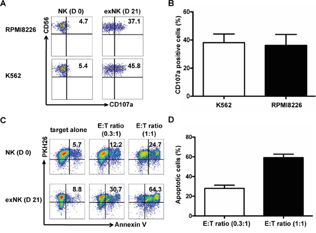 In these experiments, K562 cells, which are sensitive to NK cells-mediated killing, were used as a positive control, and CD3-CD56+CD107a+ cells were defined as degranulated NK cells. Our results showed that the exNK cells presented a strong degranulation capacity after cocultured with K562 and RPMI8226 as targets, respectively (Figure 3A and 3B).