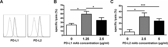 Figure 4: PD-L1/PD-L2 blocking enhanced expanded NK cell cytotoxicity. Expanded NK cells on day 21 of culture (exNK) were collected and used as effector cells. RPMI8226 cells (target) were pretreated with or without PD-L1/2 blocking antibodies, and exNK cell killing activity was determined by the Colorimetric MTT assay. A. Representative histogram plots showing PD-L1 and PD-L2 expression on RPMI8226 cells (n=3). B. Comparison of exNK cell-mediated lysis of RPMI8226 cells treated by an anti-PD-L1 mAb at the indicated concentrations with E:T ratio of 1:1. Results are shown as mean ± SEM (n=3, *P<0.05, by Student's t test). C. ExNK cells-mediated lysis of RPMI8226 cells treated by an anti-PD-L2 mAb at the indicated concentrations with E:T ratio of 0.5:1. Values are shown as mean ± SEM (n=3, *P<0.05, ***P<0.001, by Student's t test).