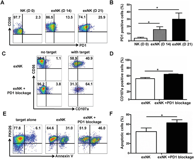 Figure 5: PD1 expression on expanded NK cells, and PD1 blocking enhanced exNK cell degranulation and cytolytic activity. PD-1 expression on NK cells was tested on the time-points indicated using flow cytometry method. A. Dot plots from one representative experiment depicting PD1 expression on resting NK (D 0) and expanded NK (exNK) cells on day 14 (D 14) and 21 (D 21). B. Comparison of PD1 expression on the resting NK, exNK (D14) and exNK (D 21) cells. The degranulation (CD107a translocation assay) and killing activity of the exNK cells without PD1 blocking and with PD1 blocking by an anti-PD1 mAb (exNK+PD1 blockage cells) was compared, and MM cell line RPMI8226 was used as target cells in these assays by following the methods described in the Materials and Methods. C. Representative flow cytometry results showed CD107a positive (degranulated NK) cells: exNK cell spontaneous degranulation (no target) and degranulation triggered by the target cells (with target). D. Comparison of degranulated NK cells between exNK without PD1 blocking (exNK) and exNK-PD1 blockage cells. E. Dot plots from one representative example depicted spontaneous apoptosis and apoptosis of RPMI8226 induced by exNK and exNK-PD1 blockage, respectively. F. Comparison of apoptosis in the RPMI8226 cells induced by exNK and exNK-PD-1 blockage. Results from three independent experiments are shown as mean ± SEM (*P<0.5, by Student's t test).