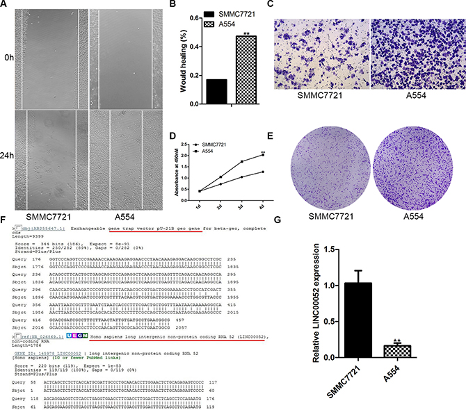 Figure 1: LINC00052 gene was trapped by PU21 in A554 cell line. (A, B) Wound healing assay, SMMC77212 cells as a control. (C) Transwell assay, SMMC77212 cells as a control. (D, E) Cell proliferations assay, SMMC77212 cells as a control. (F) 5′RACE result showed that LINC00052 gene was trapped by PU21 vector in A554 cell line. (G) LINC00052 expressions were detected with real-time PCR in A554 cells, SMMC77212 cells as a control.