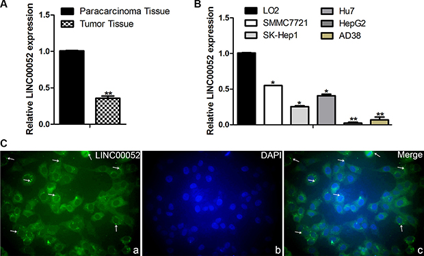Figure 2: Analysis the expression of LINC00052 in HCC tissue and HCC cell lines. (A) The expressions of LINC00052 in HCC tissue, the paracarcinoma tissue as a control. (B) The expressions of LINC00052 in HCC cell lines, LO2 cells as a control. (C) The cellular localization of LINC00052 was identified with FISH. a: LINC00052 RNA probe, b: DAPI Staining, c: Merge. Original magnification: 400 × .
