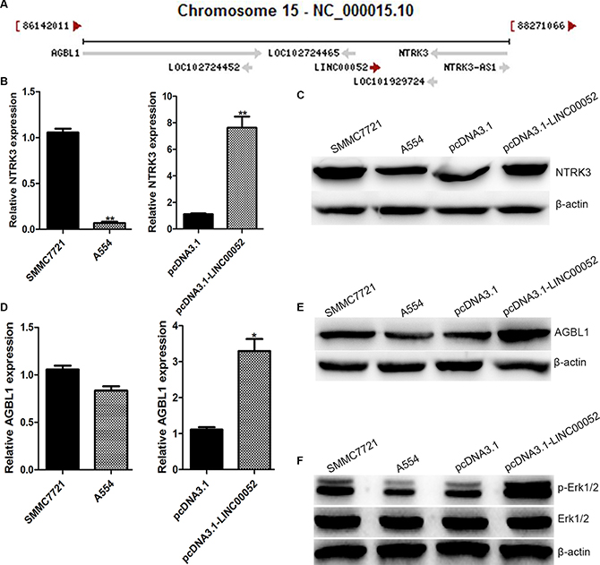 Figure 4: NTRK3 was a target gene of LINC00052. (A) LINC00052 was located between AGBL1 and NTRK3 on chromosome 15. (B) Expressions of NTRK3 in Low LINC00052 expression (A554 cells) and High LINC00052 expression (pcDNA3.1-LINC00052 cells) cells were detected with real-time PCR and western blotting (C). (D) Expressions of AGBL1 in Low LINC00052 expression (A554 cells) and High LINC00052 expression (pcDNA3.1-LINC00052 cells) cells were detected with real-time PCR and Western blotting (E). (F) Expressions of p-Erk1/2 in Low LINC00052 expression (A554 cells) and High LINC00052 expression (pcDNA3.1-LINC00052 cells) cells were detected with Western blotting.