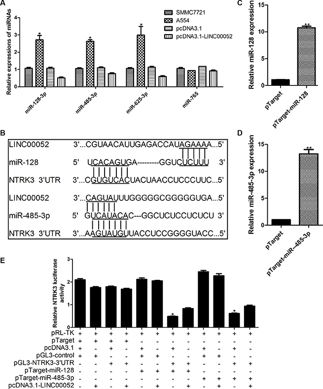Figure 5: LINC00052 modulated NTRK3 expression by interacting with miR-128 and miR-485-3p. (A) Expressions of microRNAs which involved in regulating MTRK3 were checked in low LINC00052 expression (A554 cells) and high LINC00052 expression (pcDNA3.1-LINC00052 cells) cells. (B) miR-128 and miR-485-3p could form complementary bases with LINC00052 and NTRK3 3′UTR. (C), (D) Over expression miR-128 and miR-485-3p were constructed and verified by real-time PCR. (E) Luciferase activity of NTRK3 3′UTR were detected after cotransfected with pTarget-miR-128, pTarget miR-485-3p and pcDNA3.1-LINC00052. pTarget, pcDNA3.1 and pGL3-control were used as controls.