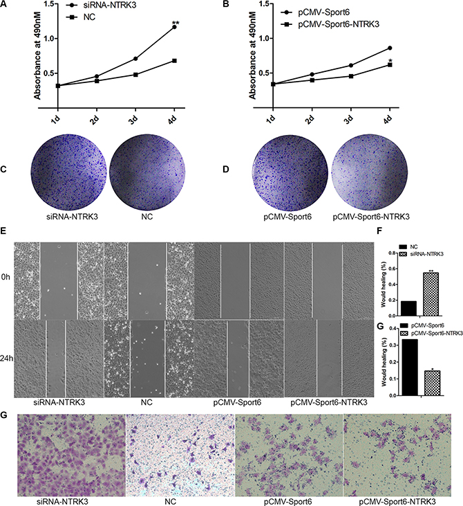 Figure 6: Analysis of NTRK3 functions in cells proliferation, invasion and migration. (A) Cell proliferations were verified when NTRK3 expression were inhibited with siRNA or when NTRK3 expression were over expressed (B). (C), (D) Colony formation assay. (E, F, G) Wound healing assay. (F) Transwell assay. NC and pCMV-Sport6 were used as controls.