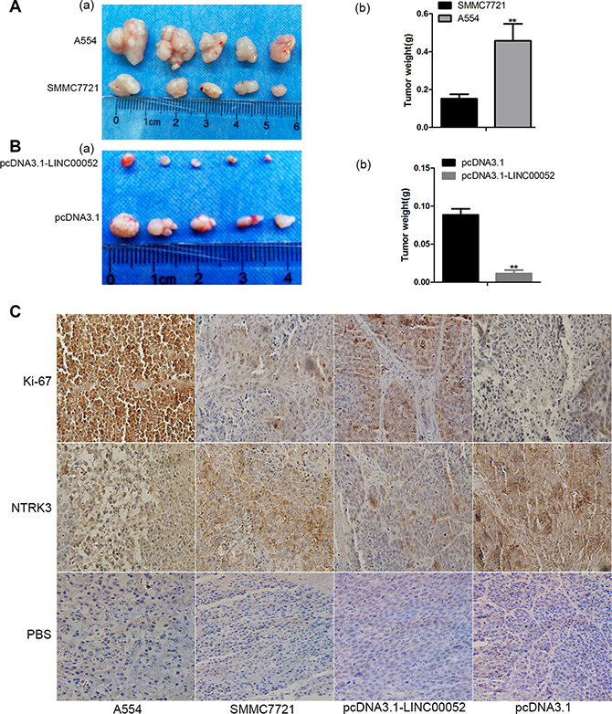 Figure 7: Role of LINC00052 in tumor development in vivo. (A) Tumor sizes were recorded (a) and weighed (b) after A554 cells were injected (low LINC00052 expression), SMMC7721 cells as a control. (B) Tumor sizes were recorded (a) and weighed (b) after LINC00052 stable over expression cells were injected, pcDNA3.1 stable cells as a control. (C) Ki-67 and NTRK3 immunostaining in transplanted tumors. PBS used as a control. Original magnification: 400 × .