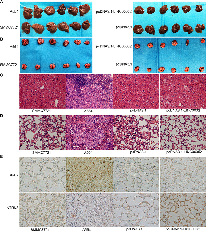 To investigate the functional role of LINC00052 in tumor migration potential in vivo, cells stably over-expressing LINC00052 (pcDNA3.1-LINC00052), or cells down-expressing LINC00052 (A554) and their control cells were injected into liver of nude mice, respectively. 24 days later, nude mice were sacrificed and the migration potential were analyzed. We found that in A554 group, some metastatic lesions were found in liver and especially in lung tissue compared with SMMC7721 group, but in pcDNA3.1-LINC00052 group, no metastatic lesions were found in liver and lung tissue compared with pcDNA3.1 group (Figure 8A, 8B). Also tumor cell migration in liver and lung tissues were detected by HE staining assay. The results showed that in A554 group, a large number of lymphocytes were found in liver and lung tissue compared with SMMC7721 group, but in pcDNA3.1-LINC00052 group, no lymphocytes were found in liver and lung tissue compared with pcDNA3.1 group (Figure 8C, 8D). Furthermore, the lung immunohistochemistry results revealed that increased expression of proliferation marker Ki-67 and decreased expression of NTRK3 in LINC00052-deplted group. In contrast, decreased expression of proliferation marker Ki-67 and increased expression of NTRK3 were observed in LINC00052-overexpressing group (Figure 8E). Taken these results together, we concluded that LINC00052 could influence tumor migration in vivo.