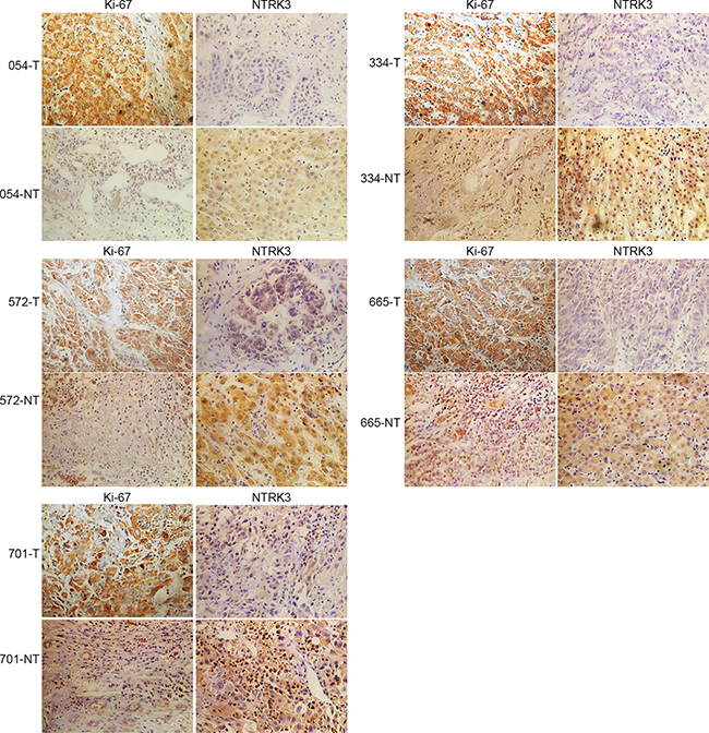 Figure 9: NTRK3 is down-regulated in human HCC tissue. Human HCC tissue and paracarcinoma tissue sections were immunohistochemistry staining with Ki-67 and NTRK3 (magnification: 400 × ).
