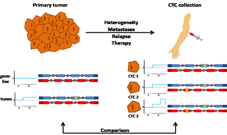 Figure 1: Analyses of the genomes of a primary tumor and CTCs. The genomes of tumor cells from a primary tumor and nonmalignant cells from the same patient are analyzed for copy number changes and mutations at nucleotide level (shown on the left side). The comparison of variants in nonmalignant cells (i.e. the germline) with those observed in tumor cells allows the detection of tumor-specific, somatic changes. Here, no copy number variations were observed in the germline (illustrated exemplarily for the short (p) and long (q) arm of one chromosome, and no mutations were identified in two genes (shown with blue and red exons, respectively). In contrast, tumor cells had a copy number change (indicated by a gain of the long arm) and a mutation (indicated by the yellow star in the blue gene). While analysis of the primary tumor is usually done at the time of diagnosis, CTCs can be analyzed at any time during the disease course and are obtained simply by blood collection (right side). The genomes of the CTCs may differ from the initial analysis of the primary tumor for various reasons (see text). If CTCs are analyzed on a cell-by-cell basis, they may reveal heterogeneity. For example, CTC1 has the same changes as the primary tumor, CTC2 has an additional mutation in another gene (indicated by a yellow star in the red gene), whereas CTC3 has in addition a novel copy number change (i.e. high level amplification on the q-arm). Comparison between the genome of the primary tumor with the genomes from CTCs provides information about the evolution of the tumor genome and potentially novel biomarkers.