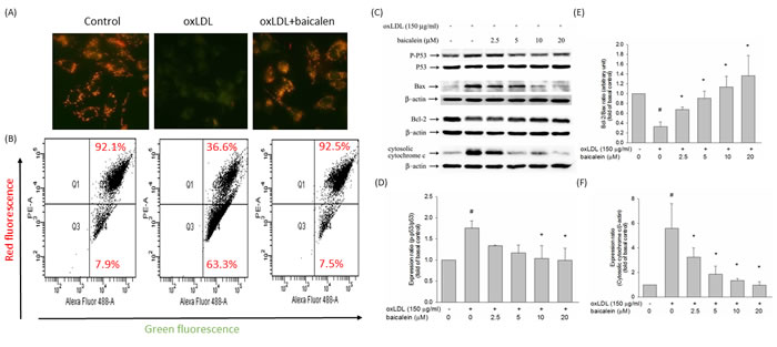 Figure 5: Effect of baicalein on mitochondrial transmembrane permeability transition and apoptosis. Cells were incubated with 20 µM baicalein for 2 hours and then incubated with 150 µg/ml oxLDL for an additional 24 hours. A. The change in mitochondrial membrane potential was assessed based on the signal intensity from monomeric and J-aggregate JC-1 fluorescence as described in materials and methods. (left) No treatment; (middle) oxLDL; and (right) oxLDL + baicalein. B. JC-1 fluorescence was confirmed by flow cytometry. Green fluorescence intensity indicates the cells with low ΔΨm, while the red fluorescence intensity indicated the cells with stable ΔΨm. Effects of baicalein on dephosphorylation of p53, analysis of Bcl-2 family proteins, and mitochondrial cytochrome c release in response to oxLDL and baicalein. HUVECs were incubated with 150 mg/ml oxLDL in the absence or presence of indicated concentrations of baicalein for 24 hrs. Representative, Western blots C. and summary data D.,E.,F. show that oxLDL upregulated pro-apoptotic (Bax) proteins and downregulated anti-apoptotic (Bcl-2) proteins and increased the abundance of cytochrome c in the cytosolic fraction, whereas baicalein pretreatment suppressed these apoptosis-provoking alterations. Results were subjected to densitometric analysis. Data of bar figure represent means±SEM of 3 independent analyses. # P < 0.05 compared with control and *P < 0.05 compared with oxLDL-stimulated HUVECs.