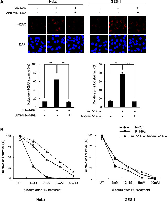 Figure 1: Increase of DNA damage sensitivity by miR146a. (A) Two days after transfection of HeLa or GES-1 cells with miR146a alone or together with anti-miR146a, the cells were treated with 5 mM HU for 16 h to detect residual γ-H2AX. Results are shown as the mean ± SD (n = 3); **P < 0.01. (B) HeLa and GES-1 cells were transfected with control, miR146a, and miR146a plus anti-miR146a, and were then exposed to increasing concentrations of HU for 5 hr. The viability of treated cells was examined using the clonogenic survival assay. Results are shown as the mean ± SD (n = 3); **P < 0.01.