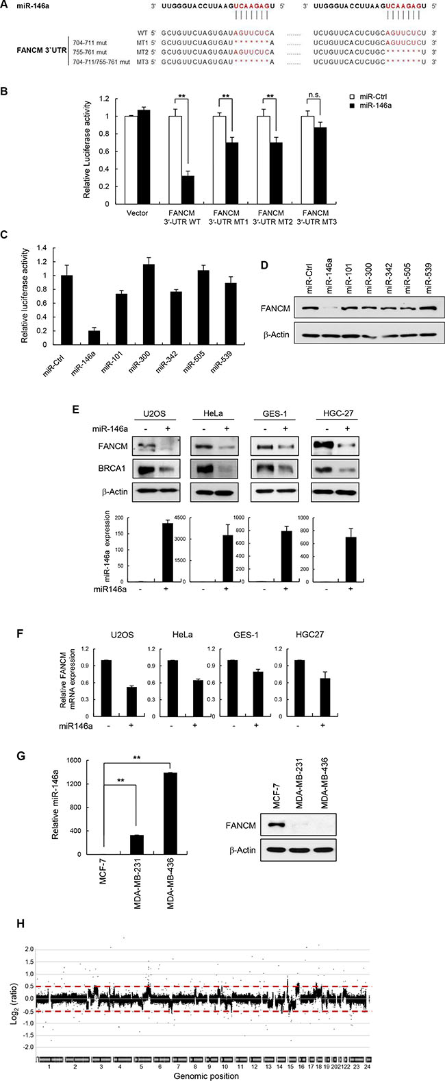 Figure 2: miR146a directly targets FANCM. (A) Schematic diagrams show the sequence and position of predicted miR146a binding sites in the FANCM 3′UTR. Single- (M1 and M2) and double- (M3) deletion mutations of the miR146a target sites were shown. The seed resion of miR146a is in red. (B) FANCM 3′UTR-WT and FANCM 3′UTR-MT1-3 were cotransfected with miR146a into HeLa cells. Luciferase activity was measured 24 h after transfection. Data represent the mean ± SD (n = 3); **P < 0.01. (C) HeLa cells were cotransfected with the FANCM 3′UTR luciferase reporter vector along with the candidate miRNAs, which were predicted by Targetscan v6.2, or the miRNA-negative control (miR-Ctrl). Results are shown as the mean ± SD (n = 3). (D) The levels of FANCM protein were measured by western blotting after transfection of miR146a into a number of cell lines as indicated. (E) Western blot analysis using cell extracts was performed to detect cellular levels of FANCM and BRCA1 after transfecting indicated cells with miR146a (top). In parallel, the transfected cells were subjected to RNA extraction, followed by RT-qPCR to measure the amount of miR146a after transfection. The relative amount of miR146a was quantified and shown as the mean ± SD (n = 3); **P < 0.01 (bottom). (F) Expression of FANCM mRNA in miR146a transfected cells was quantitated using real-time qPCR. Results are shown as the mean ± SD (n = 3); **P < 0.01. (G) Three different breast cancer cell lines, MCF7, MDA-MB-231, and MDA-MB-436, were cultured and cell extracts were analyzed for evaluating miR146a (left) and FANCM expression (right) using Western blotting and RT-qPCR, respectively. Results are shown as the mean ± SD (n = 3); **P < 0.01. (H) Array CGH profiles of human fibroblast GM00637 cells transfected with miR146a versus control miRNA. Chromosomal regions above or below the red dotted line indicate gains or losses of corresponding genomic positions, respectively.