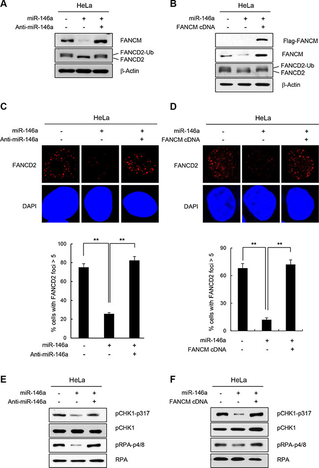 Figure 3: Effect of miR146a on FANCD2 monoubiquitination and the FA pathway. (A and B) HeLa cells were transfected with miR146a in the absence or presence of anti-miR146a (A) or miR146a-insensitive FANCM cDNA (B). After a 48 h transfection, the cells were treated with 5 mM HU for 5 h. The protein levels of FANCM and FANCD2 were measured by western blotting. Monoubiquitinated FANCD2 is indicated as the upper band of doublet protein bands corresponding to FANCD2. (C and D) After HeLa cells underwent the same treatment as (A and B) cells were analyzed for FANCD2 foci formation. DAPI was used for nuclear staining. Results are shown as the mean ± SD (n = 3); **P < 0.01. (E and F) Indicated cells were treated with 5 mM HU for 5 hr. Cell lysates were analyzed by Western blotting with antibodies against pCHK1-S317, CHK1, pRPA-S4/8, and RPA.