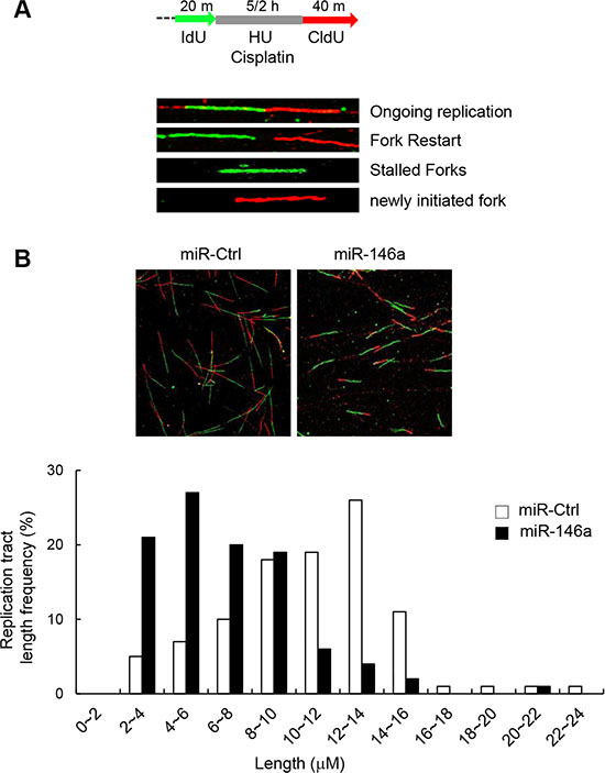 Figure 4: Effect of miR146a on replication fork restart. (A) Schematic of a single DNA fiber analysis is depicted. For DNA fiber analysis, after being transfected with miR146a or a control miRNA, GES-1 cells were labeled with IdU for 20 min, followed by exposure to HU for 5 hr and chased with CldU for 40 min. (B) Representative images of spread DNA fibers from miR146a-expressing cells versus control cells (top). Nascent track length distribution curves were plotted after measuring the length of CldU tracts from DNA fibers with two consecutive colors of green (IdU) and red (CldU).