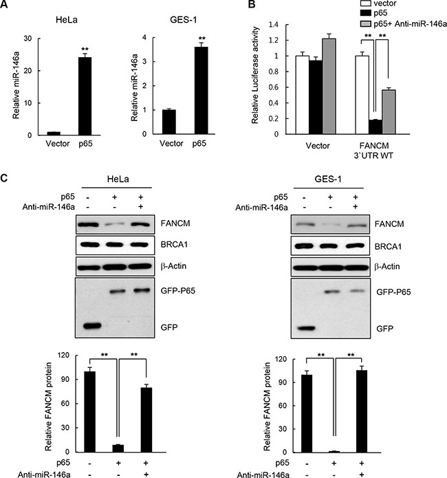 Figure 5: Effect of NF-κB on FANCM expression. (A) HeLa or GES-1 cells were transfected with the p65 expression construct and miR146a levels in the indicated cells were determined using RT-qPCR analysis. Results are shown as the mean ± SD (n = 3); **P < 0.01. (B) Luciferase reporter gene construct carrying the wild type or mutated 3′-UTR of FANCM was cotransfected with p65 cDNA or p65 cDNA plus anti-miR146a, as well as a control vector into HeLa cells. Luciferase activity was measured 24 hours after the transfection. Data represent the mean ± SD (n = 3); **P < 0.01. (C) HeLa or GES-1 cells were transfected with p65 construct in a combination of Anti-miR146a or a control miRNA, and indicated protein levels were determined by western blotting (top). Quantitative densitometry of FANCM protein expression is shown below, expressed as the mean ± SD (n = 3).
