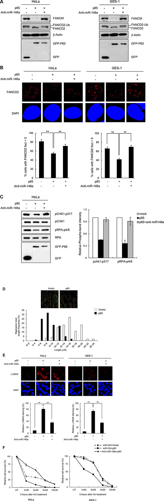 Figure 6: NF-κB reiterating miR146a function in the FA pathway and replication fork restart. (A) Two days after transfection of cells with p65 cDNA and anti-miR146a in combination as indicated, cells were treated with 5 mM HU for 5 h. The levels of FANCM and p63 proteins, and FANCD2 ubiquitination were measured by western blotting. (B) After undergoing the same treatment as (A) HeLa cells were analyzed for FANCD2 foci formation. Results are shown as the mean ± SD (n = 3); **P < 0.01. (C) Under the same conditions described in (A) cell lysates were analyzed by western blotting with antibodies against pCHK1-S317, CHK1, pRPA-S4/8, RPA, and GFP. Right, quantitation of pCHK1-S317 and pRPA-S4/8 expression. Results are shown as the mean ± SD (n = 3). (D) GES-1 cells transfected with p65 construct were applied to DNA fiber analysis. Resulting images of DNA fibers of p65-overexpressing cells compared with control cells (top). CldU tract length distribution was determined (bottom). (E) HeLa or GES-1 cells with the same treatment as A were subjected to γ-H2AX detection. Results are shown as the mean ± SD (n = 3); **P < 0.01. (F) HeLa and GES-1 cells were transfected with p65 construct and Anti-miR146a in combinations as indicated and were treated with different doses of HU for 5 hr. Cell survival thereafter was measured using clonogenic survival assay. Results are shown as the mean ± SD (n = 3); **P < 0.01.