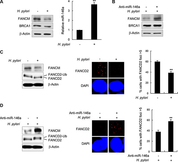 Figure 7: H. pylori-mediated FANCM regulation. (A) After infection of GES-1 cells with H. pylori, FANCM and BRCA1 protein levels were determined by western blotting (left). The effect of H. pylori on miR146a was determined by RT-qPCR (right). Results are shown as the mean ± SD (n = 3); **P < 0.01. (B) GES-1 cells infected with H. pylori were transfected with anti-miR146a, and FANCM and BRCA1 protein levels were determined by western blotting. (C) H. pylori -infected GES-1 cells were treated with 5 mM HU for 5 hours, FANCD2 monoubiquitination (left) and its foci forming activity (right) were examined by western blotting and immunostaining, respectively. Data respresent the mean ± SD (n = 3). **P < 0.01.(D) H. pylori-infected GES-1 cells were transfected with anti-miR146a and treated with 5 mM HU for 5 hours. FANCD2 monoubiquitinating activity (left) and subsequent foci formation (right) were measured by western blotting and fluorescent cell staining, respectively. Results are shown as the mean ± SD (n = 3). **P < 0.01.