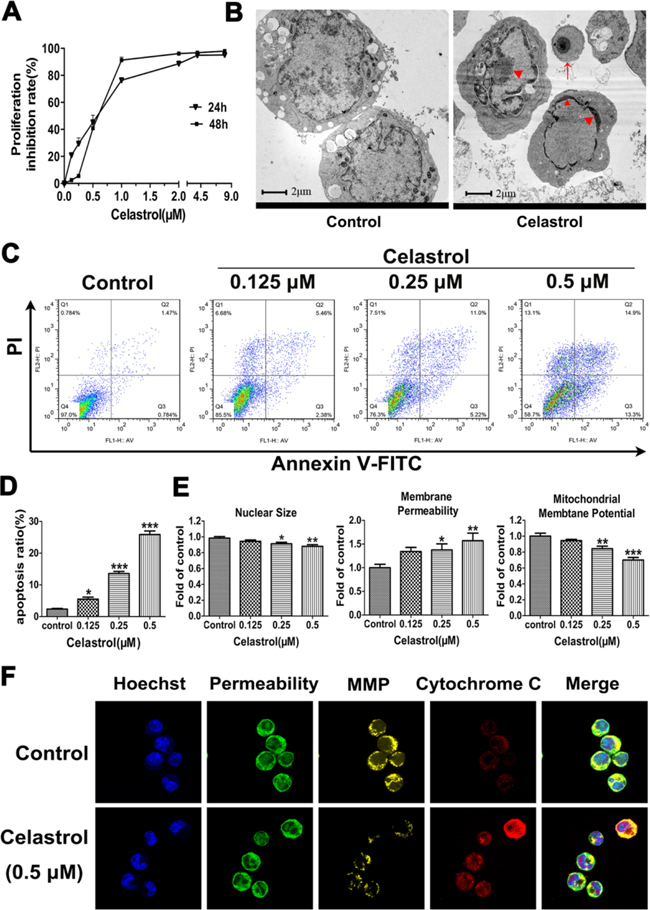 Figure 1: The effects of celastrol on cell proliferation and apoptosis in HL-60 cells. A. Effect of celastrol on cell proliferation. Data represented the mean of five replicates. Each performed in triplicate. B. Characteristic apoptotic morphological changes were assessed by transmission electron microscopy. The concentration of celastrol was 0.5 μM. Arrow indicates apoptotic body and triangles indicate nuclear condensation and margination. Scale bar: 2 μm; Magnification, ×20,000. C. Flow cytometry analysis of cell apoptosis. D. The chart illustrates the percentage of apoptotic cells from three independent experiments. E. The quantitative analysis of nuclear size, membrane permeability and mitochondria membrane potential. F. Representative images from confocal microscope. MMP: Mitochondrial Membrane Potential. The concentration of celastrol was 0.5 μM. Magnification, ×630. Asterisks indicate statistical significance (*p < 0.05, **p < 0.01, ***p < 0.001).