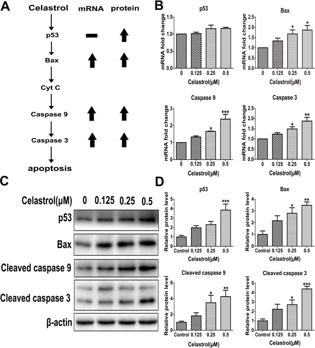 Figure 2: The mRNA and protein levels of apoptosis-related genes. A. Schematic illustration of apoptosis pathway. B. Real-time PCR analysis of TP53, BAX, CASPASE 9 and CASPASE 3 mRNA levels. C. The protein levels of cleaved caspase 9, cleaved caspase 3, p53 and Bax with western blot analysis. D. The integrated option density of target protein bands was quantified by Image-Pro Plus software. Results represent three independent experiments performed in triplicate. Asterisks indicate statistical significance (*p < 0.05, **p < 0.01, ***p < 0.001).